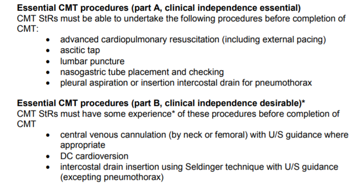 Assim como no Foundation Programme, ao final do Core Medical training existe uma série de competências que você deve cumprir para prosseguir para o Specialty Trainig. Estas informações estão disponíveis aqui em um documento semelhante ao apresentado acima. Com relação aos procedimentos essenciais e desejáveis (“extras”):